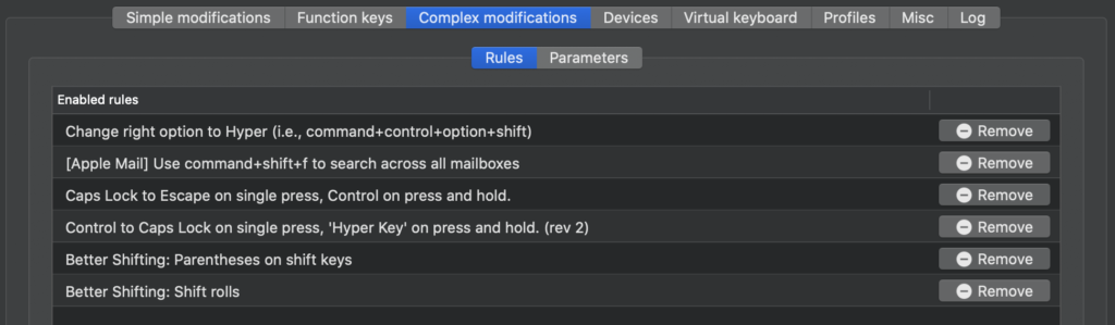 - Left control to hyper key for extra modifier key. I use this to open and bring apps to front.