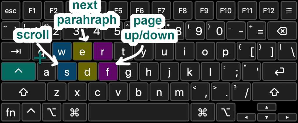 - ctrl+w/s to scroll the document. This is a KM macro that simulates the scroll wheel.