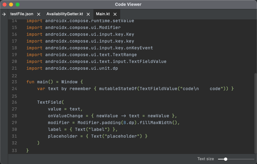 The result is a fully fledged code editor in a Compose Desktop app. Thanks to RSyntaxTextArea and Swing integration, the developer needs to write only a minimal amount of code. And the result in MacOS feels as performant as any other IDE.